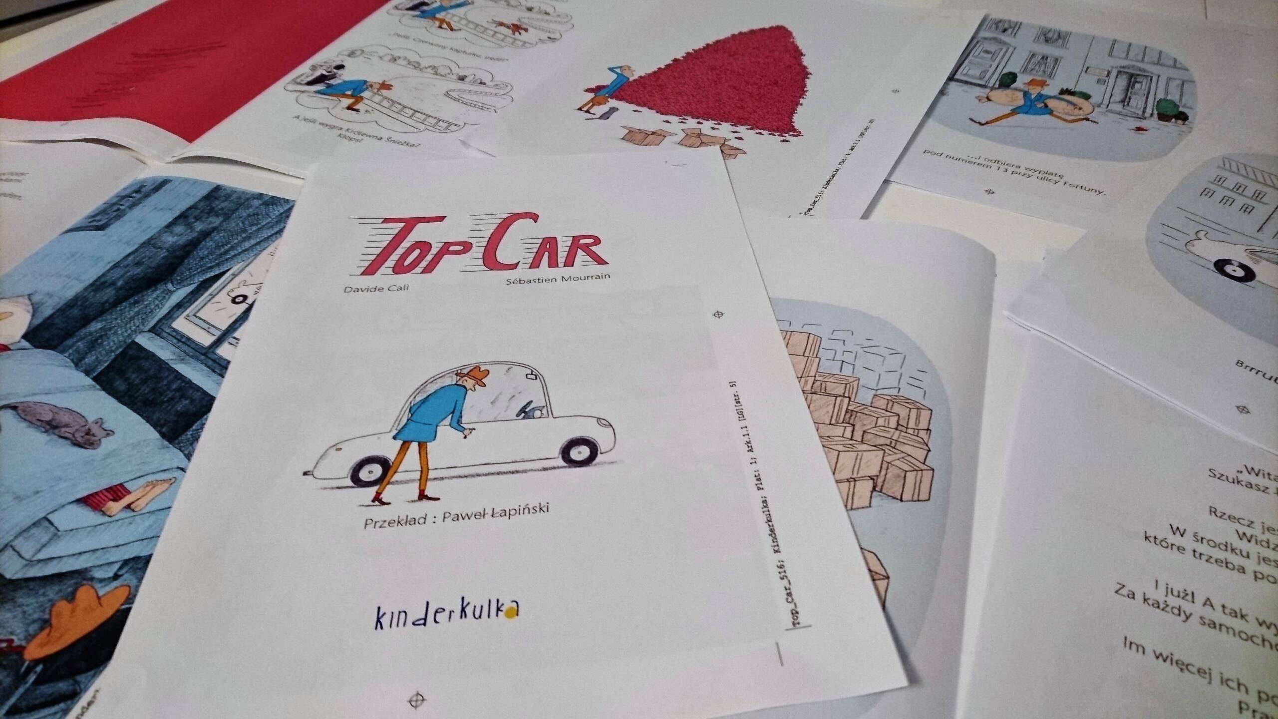 Jesteśmy coraz bliżej. „Top Car” autorstwa Davide Cali z ilustracjami Sebastiena Mourrain’a – jeszcze w kawałkach, nie zszyta, ale niebawem będzie z nami.