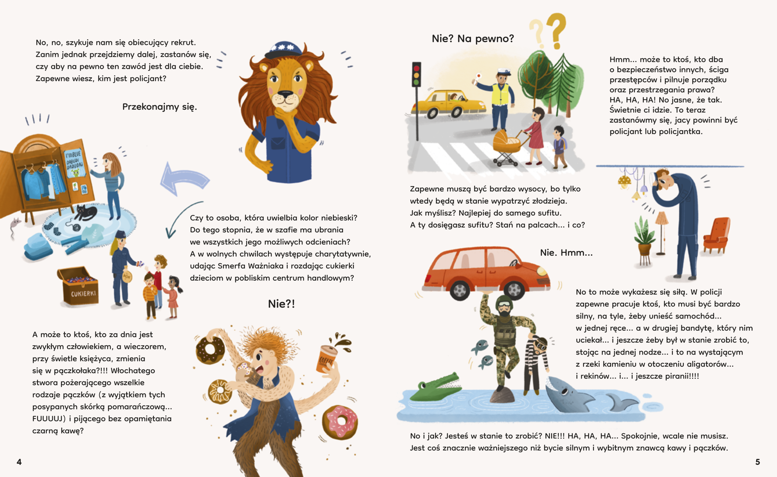 Młody czytelnik zaczyna swoją przygodę jako rekrut. Chcąc zostać policjantem będzie musiał przejść pomyślnie rozmowę kwalifikacyjną oraz zdać test sprawności fizycznej. Cały ten proces, a także każdy kolejny etap, będzie nadzorował sam Komisarz Lew, maskotka dolnośląskiej policji.
