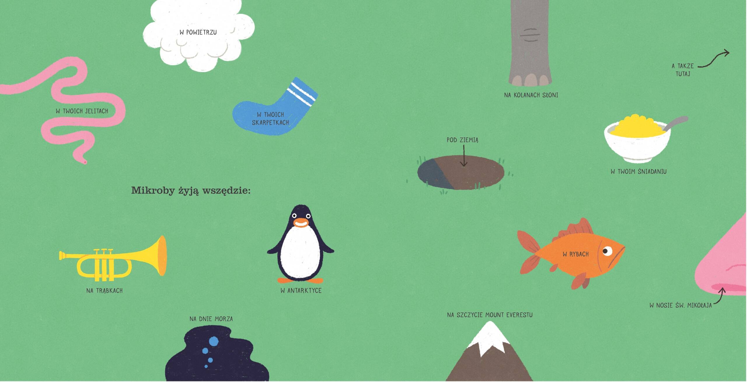 Ta urocza i pełna humoru książeczka edukacyjna łączy prosty tekst, komiksowe cyfrowe ilustracje, fotografię mikroskopową i interakcję z czytelnikiem. A wszystko to po to, aby przekazać dzieciom wiedzę o zarazkach: o tym, gdzie mieszkają, jak łatwo są przenoszone i jakich są rozmiarów.
